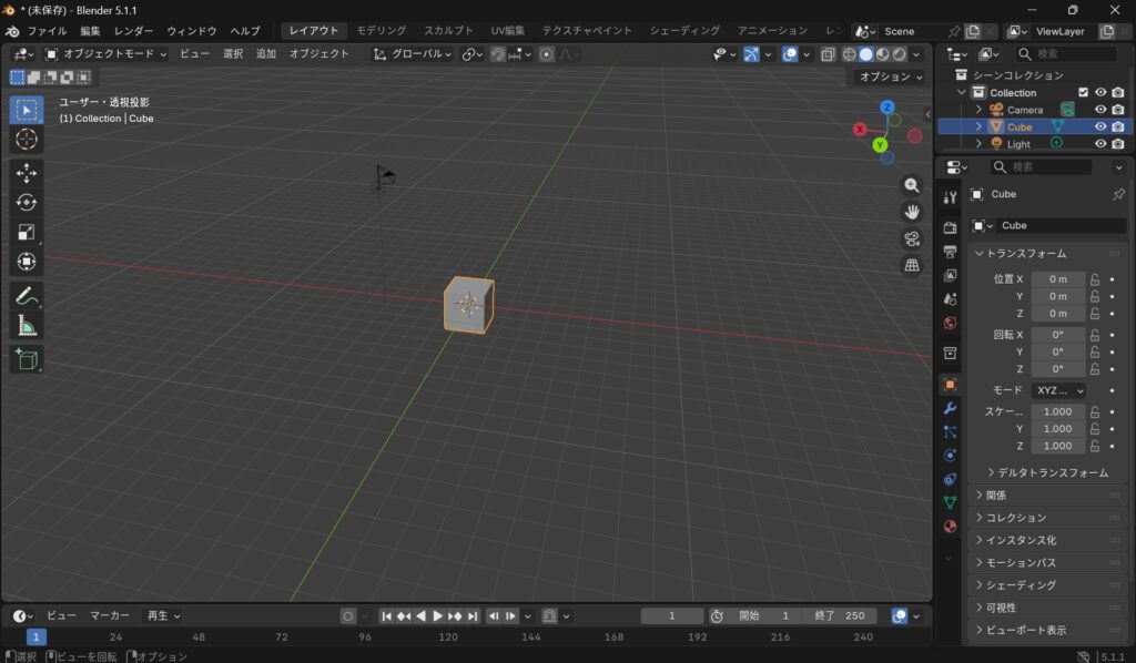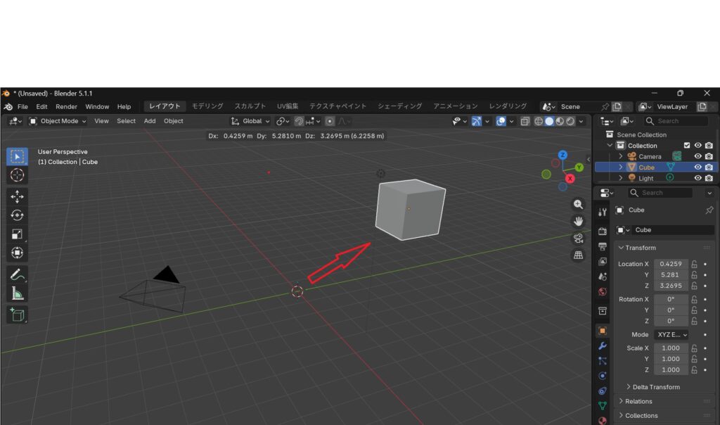 立方体を選択した状態でGキーを押してマウスを動かすと移動する。